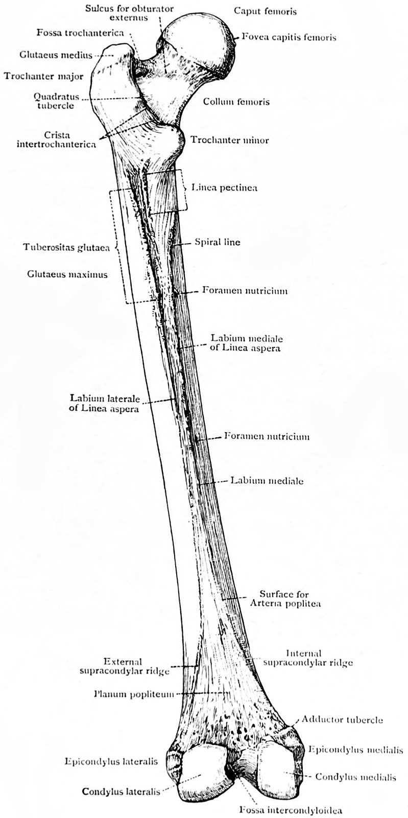 Крепкая форма бедренной кости предоставляет множество надёжных точек прикрепления для мощных мышц бедра и колена, которые способствуют ходьбе и другим двигателям движениям.[1]