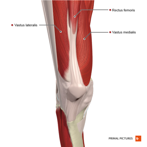 | Четырехглавая мышца бедра: Латеральная широкая мышца бедра (VL) Промежуточная широкая мышца бедра (VIM) Медиальная широкая мышца бедра (VM) Прямая мышца бедра (RF) | VL: большой вертел и латеральная губа linea aspera бедренной кости VIM: передняя и латеральная поверхности бедренного стержня VM: межвертельная линия и медиальная губа linea aspera бедренной кости RF: передняя нижняя подвздошная ость и подвздошная кость таза | Надколенник через сухожилие четырехглавой мышцы бедра | Бедренный нерв | VL: разгибает коленный сустав и удерживает позицию бедра и надколенника во время ходьбы и бега VIM: разгибает коленный сустав и стабилизирует надколенник VM: разгибает коленный сустав и способствует правильному движению надколенника RF: разгибает колено и сгибает бедро |
