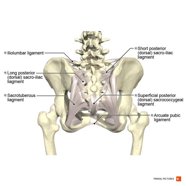 | Задняя крестцово-подвздошная связка: Короткая задняя крестцово-подвздошная связка (SPSL) Длинная задняя крестцово-подвздошная связка (LPSL) | SPSL: первые и вторые поперечные бугорки крестца LPSL: задняя верхняя подвздошная ость | SPSL: бугристость подвздошной кости LPSL: третий и четвертый поперечные бугорки крестца | Противодействует контрнутации | Сначала прощупайте верхнюю часть таза и нижнюю границу ребер. Скачайте руки внутрь и надавите вниз, чтобы прощупать подвздошный гребень. Перемещайте большие пальцы вниз, пока не почувствуете костный пик, который определяет заднюю верхнюю подвздошную ость (PSIS). Задняя крестцово-подвздошная связка может быть прощупана непосредственно ниже PSIS. |