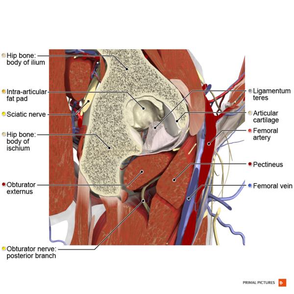- Связка круглой головки бедра иннервируется задней ветвью запирательного нерва.[3] [4]