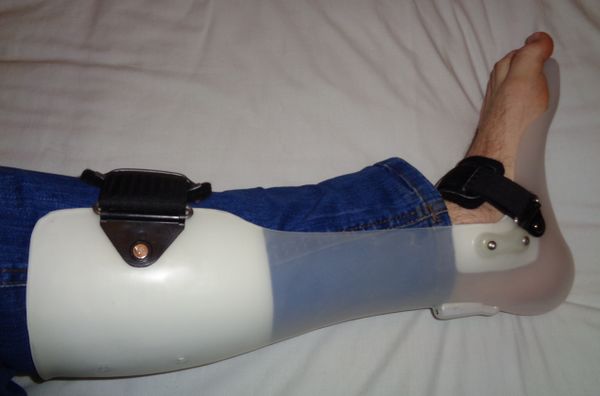 Изображение справа показывает обычный бандаж (AFO) для опущения стопы.