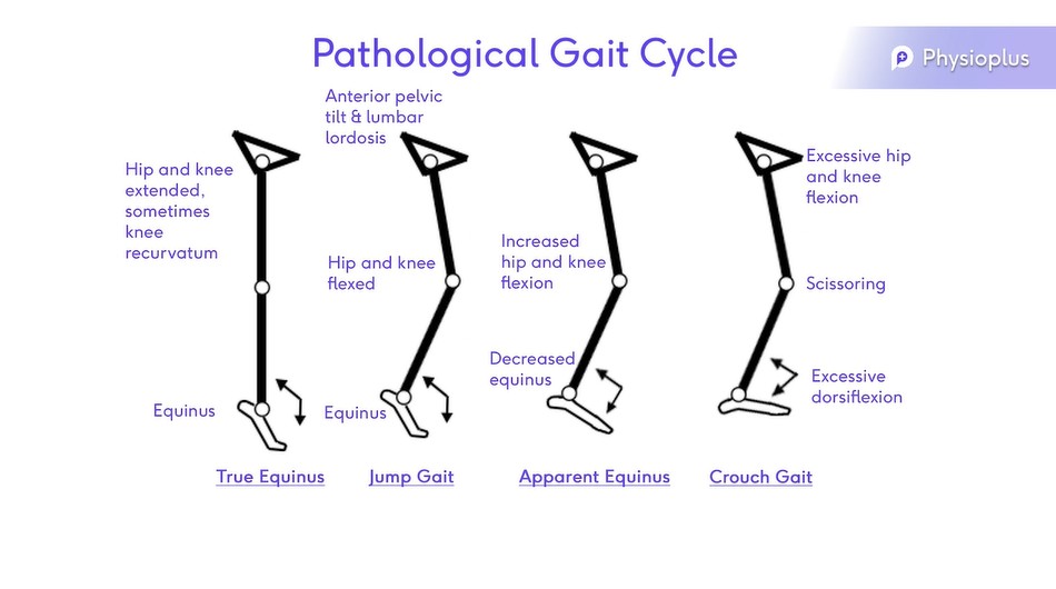 Когда нормальный цикл походки нарушается патологическим состоянием, возникают общие осложнения. Они варьируются от человека к человеку, но часто можно обнаружить закономерности. На изображениях ниже показан нормальный цикл походки и четыре патологических осложнения.