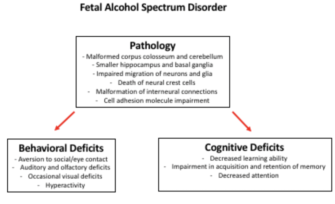 Известно, что алкоголь является тератогеном, который вызывает необратимое повреждение центральной нервной системы (ЦНС). Из ассоциаций с воздействием алкоголя мы знаем, что повреждение является обширным, вызывая не только уменьшение объема мозга, но и повреждение его структур.