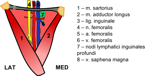 Бедренный треугольник — это полая область, расположенная в суперосрединной части переднего бедра. Он наиболее заметен при сгибании бедра, отведении и внутренней ротации. Это легкодоступная зона, через которую проходят многочисленные нервно-сосудистые структуры. Этот анатомический ориентир в основном используется при вскрытии и описании взаимосвязей в области паха.[1] Этот участок также известен как "треугольник Скарпа" и "бедренный треугольник".