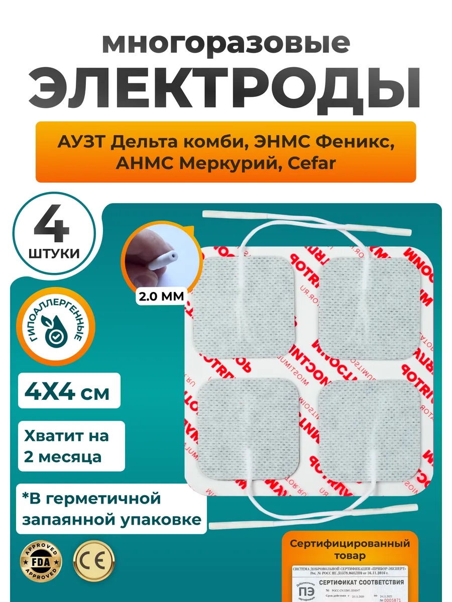 Комплект самоклеящихся электродов 4х4 см. со шнурком для АУЗТ Дельта Комби, ЭНМС Феникс, АНМС Меркурий, Cefar (внутри 4 шт.) в герметичной запаянной упаковке.