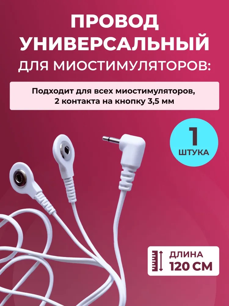 Шнур для миостимуляторов и массажеров на 2 контакта подходит к большому количеству моделей, использующих «кнопочную» систему крепления электродов с диаметром кнопки крепления 3 мм.