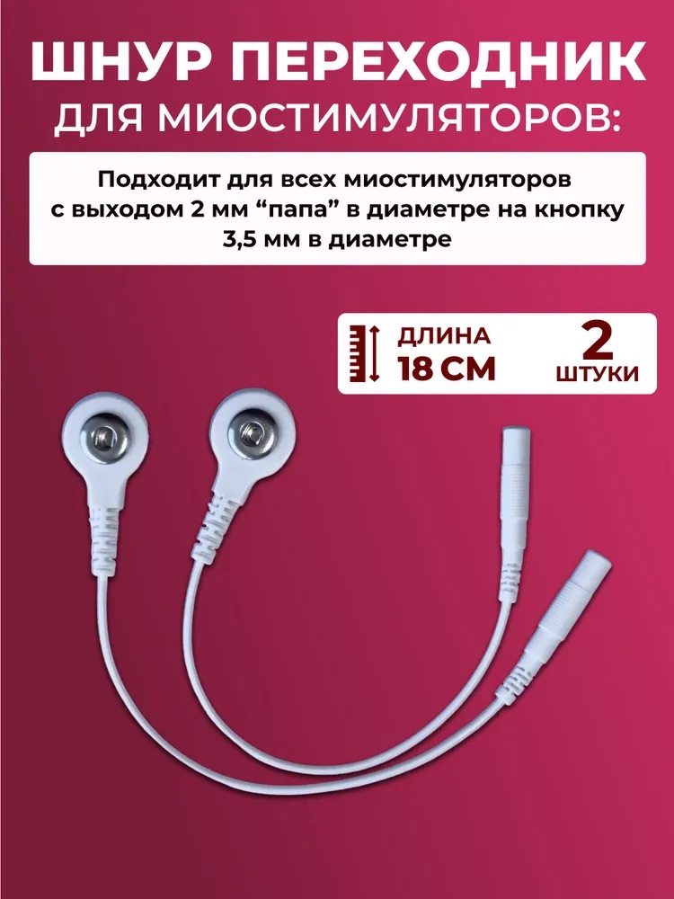 Шнур переходник с крепления электродов типа «штекер» на крепление самоклеящихся накладок с типом «кнопка» для миостимуляторов и электронных массажеров разных производителей.