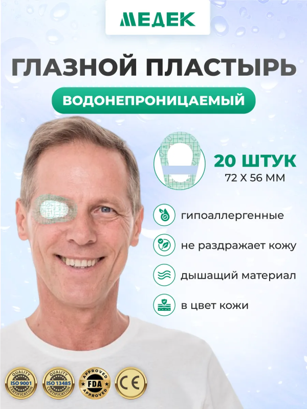 Глазной пластырь для взрослых, окклюдер 72 х 56 мм 20 штук. Каждый окклюдер пластырь в индивидуальной герметичной упаковке, аккуратно сложены в картонную коробку с инструкцией. Глазные пластыри Медек для взрослых обеспечивают надежную защиту глаза от света и грязи.