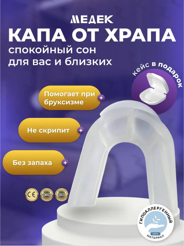 Рекомендуется носить до 22 часов в сутки, снимая только во время еды, но также можно носить только ночью. Рекомендации по использованию Перед первым использованием капу опустите в теплую воду, чтобы она стала более гибкой. Установите капу на зубы, убедившись, что она надежно фиксируется и не слетает. Носите капу всю ночь. Важно привыкнуть к ощущению во рту — это может занять несколько дней. При необходимости в первые дни можно использовать капу по несколько минут днем, чтобы ускорить адаптацию. Уход за капой Промывайте капу теплой водой перед и после каждого использования. Для очистки можно использовать мягкую зубную пасту и щетку. Храните капу в контейнере для защиты от загрязнений. Может использоваться как капа для отбеливания с соответствующими отбеливающими и реминирализующими гелями для безопасного и эффективного домашнего отбеливания и реминерализации зубов (гели не входят в комплект, приобретаются отдельно).